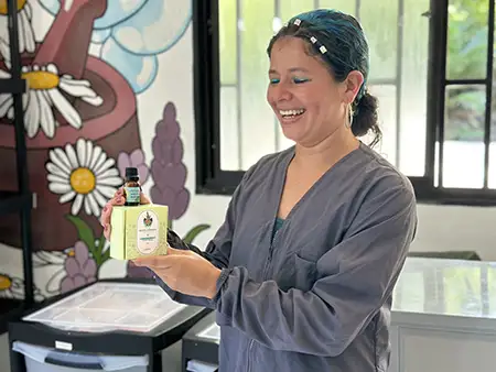 Después de dejar las armas hace nueve años, y tras más de una década en las filas de las FARC, Doris Higuita ahora cultiva plantas aromáticas para producir jabones, champú y otros productos en La Marcha: Mujeres Artesanas por la Paz, una empresa de mujeres ubicada en el pueblo de Godó, en Dabeiba, Antioquia. “Gracias a la ONU, pudimos hacer realidad nuestro sueño de producir cosméticos artesanales, ya que nos organizaron cursos y nos proporcionaron los materiales que necesitábamos”.