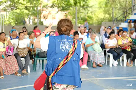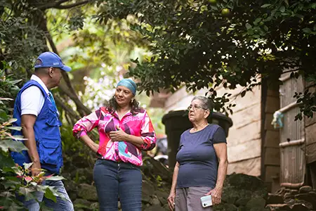 Mujeres cafeteras de la asociación ASMUPERIJÁ conversan con el personal del Programa Mundial de Alimentos que acompaña su proceso de fortalecimiento productivo.