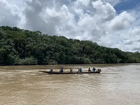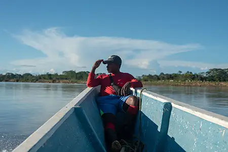 Travesía por el río Putumayo y avistamiento de delfines para llegar a la zona de reserva campesina Perla Amazónica.