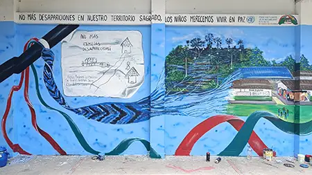 Mural en el marco de la convocatoria de búsqueda de personas dadas por desaparecidas que hace alusión a la necesidad de que los niños vivan en paz.